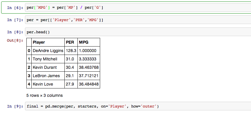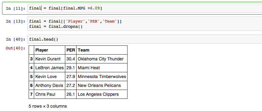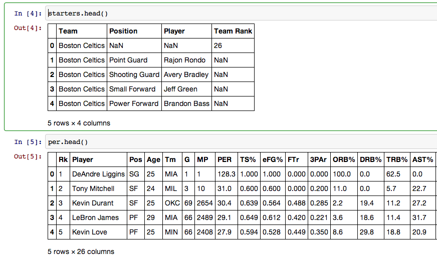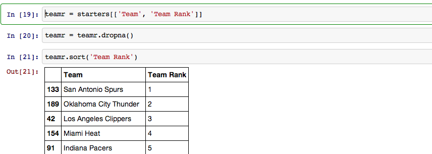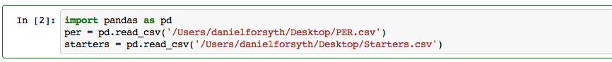 The first thing I did was import Pandas and two csv's I had downloaded. One was all of the starters from every NBA team and their respective team rank. The other included every NBA players player efficiency rating(PER), a stat that combines everything a player does on the court into one number.