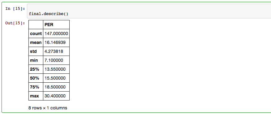 Players must play 6.09 minutes per game to be eligible for a PER rating so next I eliminated all players whose MPG fell under 6.09 minutes and then combined the starters dataframe with the PER dataframe so all of the data I was interested in was together.