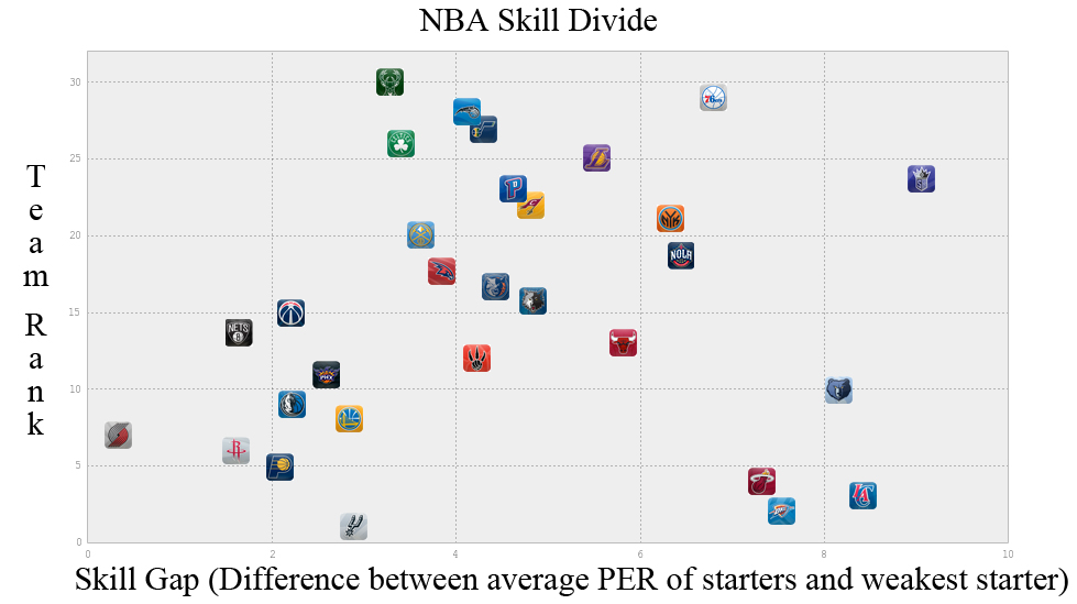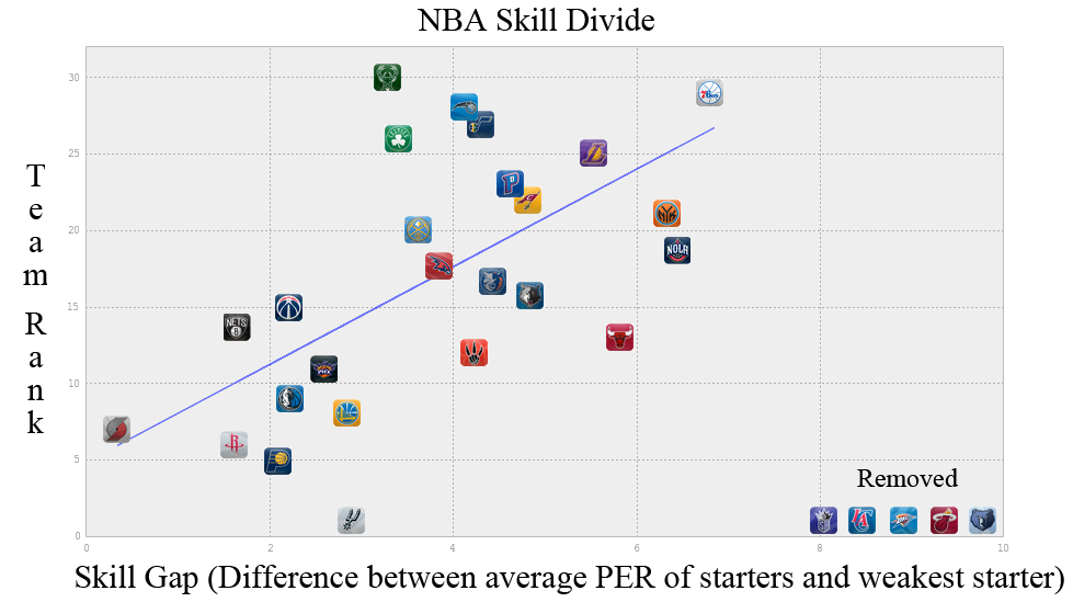 As you can see there is a, albeit weak, correlation between the skill gap and team rank with some strong outliers. The four most prominent outliers are the Miami Heat, Oklahoma City Thunder, LA Clippers, Memphis Grizzlies and Sacremento Kings. These outliers can be explained pretty easily. The Thunder have Kevin Durant, rated first overall in PER with a score of 30.17 (Michael Jordans career PER was 27.91), as well as Russel Westbrook who comes in eighth for PER. The Miami Heat, of course, have the big three of Lebron James, Dwayne Wade, and Chris Bosh. Los Angelos has Chris Paul and Blake Griffin, both in the top ten for PER and excellent compliments to each other. Sacremento has Demarcaus Cousins ranked 5th in PER and the Grizzlies while not having a starter in the top 25 for PER have Zach Randolph and Marc Gasol two very imposing big men.