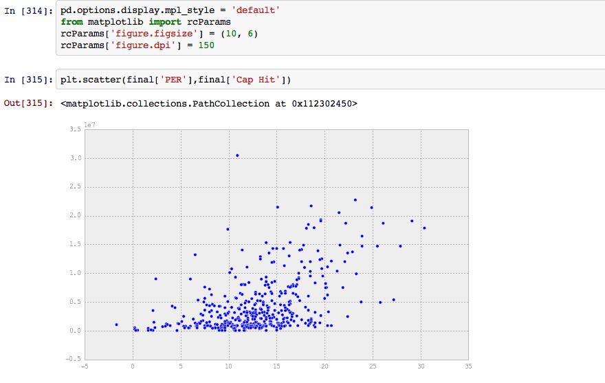 Now that we have all of the data cleaned and in the proper format we can begin plotting it and working on making predictions. Below I have created a scatter plot of the PER and Salary data.