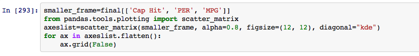 To further visualize the data I created a scatter plot matrix of the Salary, PER, and MPG.