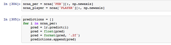 At this point it was time to show the model some data from NCAA players. I was able to scrape the PER ratings of the top 100 NCAA players from this current season off of ESPN.com. The following code displays this data.