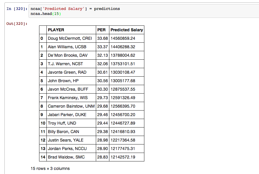The dataframe below shows the top 15 players based on PER and their predicted salary.